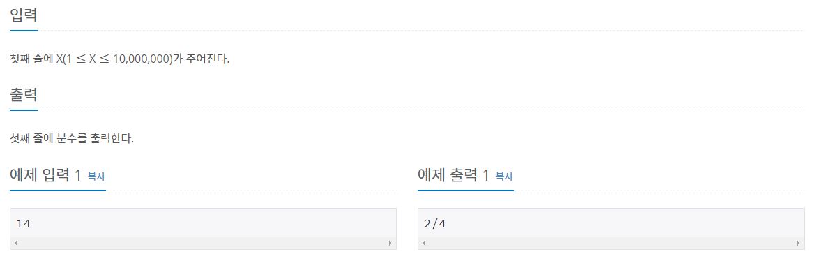 따라서, 입력받은 X를 1씩 늘려 가며 빼서 몇 번째 줄에 몇 번째 숫자인지 구하고 짝수번 째 줄인지 홀수번째 줄인지에 따라 분자, 분모의 숫자의 방향이 홀수 줄인 경우 분자는 내림차순, 분모는 오름차순이고, 짝수 줄인 경우 그 반대이다.